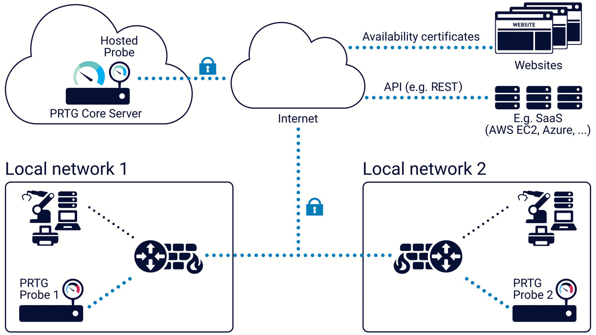 You can create additional remote probes to monitor multiple locations, to monitor a LAN with PRTG Hosted Monitor, or for several other scenarios. Remote probes use SSL/TLS-secured connections to the PRTG core server. With remote probes, you can securely monitor services and systems inside remote networks that are not publicly available or that are secured by firewalls.