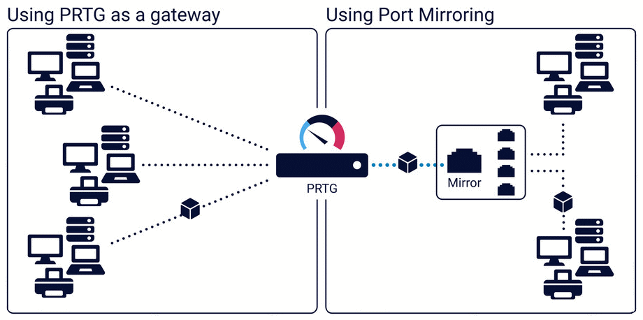 PRTG can analyze the packets that pass the network adapter of a PC or you can connect it to the monitoring port of a switch. To calculate bandwidth usage, PRTG inspects all network data packets either passing the PC's network adapter (shown on the left side in the schema above) or the data packages that a monitoring port of a switch (right side) sends with its built-in packet sniffer. Using remote probes, you can set up packet sniffers anywhere in your network.
