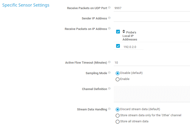 If the target device sends incorrect time information that results in wrong monitoring data, try to use 0 as the active flow timeout. This ignores the start and stop information of a flow as provided by the device and accounts all data to the current point in time. It might result in spikes but the sensor captures all data.